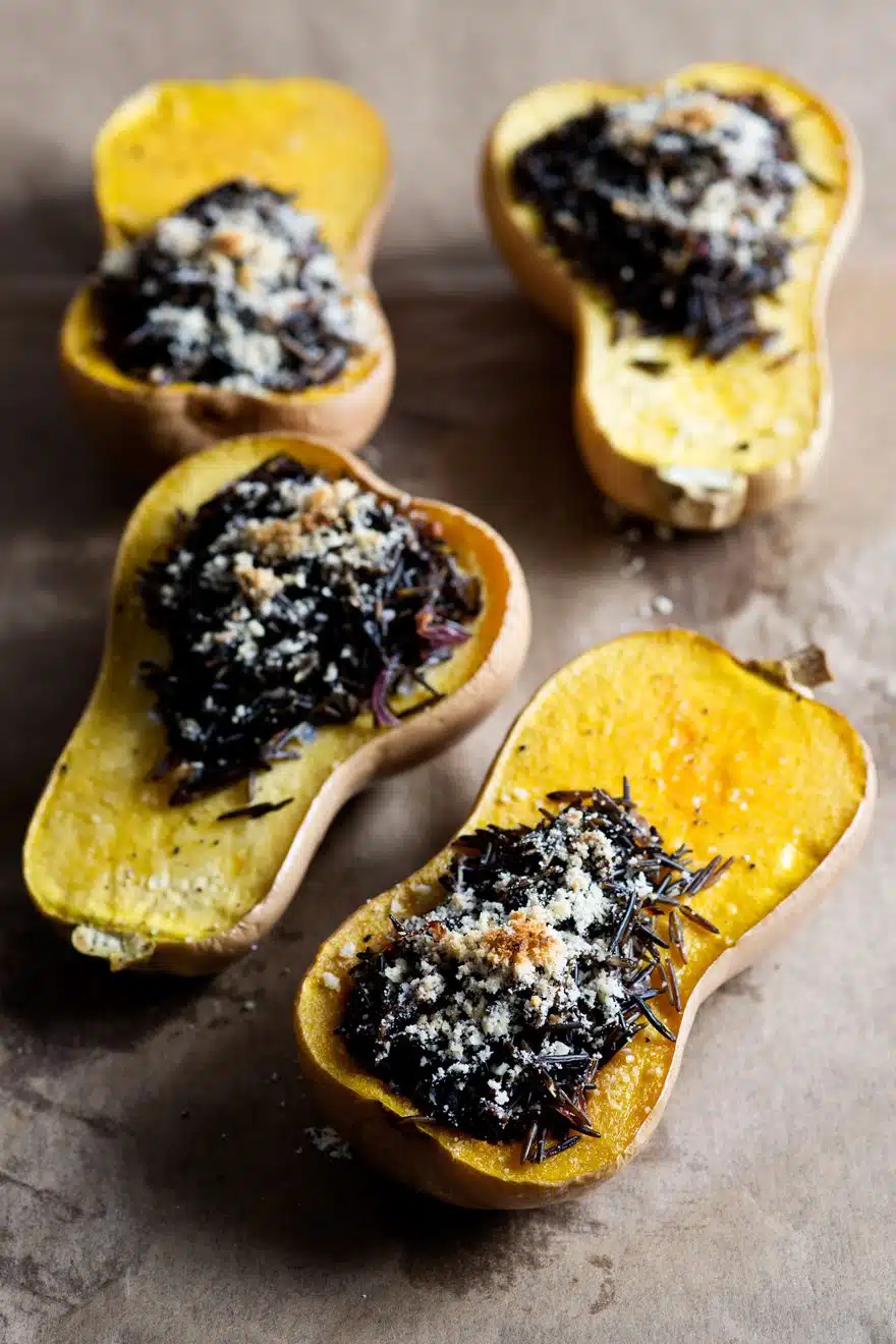 Elles sont belles, les courges butternut, avec leur silhouette androïde (c’est-à-dire en forme de poire… rien à voir avec un système d’exploitation mobile, hein). C’en est presque dommage de les couper en dés pour en faire de la soupe ou bien des poêlées. Elles en perdent un peu leur identité et se retrouvent cataloguées en « potiron » ou « courge ». Dans cette recette de butternut farcie, rôtie au four, leur forme est mise en valeur. On savoure la chair musquée des butternuts rôties à la cuillère… Le bonheur ! Bon, le plus compliqué, c’est encore de mettre la main sur des courges de petit calibre. Souvent (chez moi, en tout cas), elles ont plutôt la taille d’une massue. Une fois les butternuts parfaites de trouvées, elles se conservent de longues semaines à l’abri de la chaleur et de l’humidité (on garde cette recette sous le coude !). C’est ma copine la photographe Eugénie S. Berger qui a « shooté » ces butternuts à la sortie du four. On avait hâte d’y plonger nos cuillères !