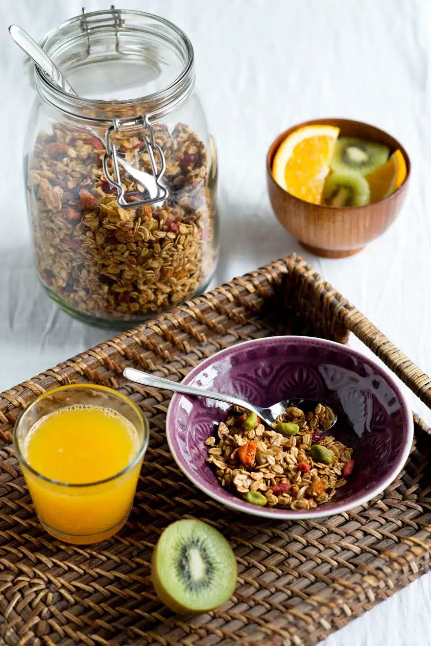 Ajouter le reste des pistaches hachées et les fruits secs (cranberries, physalis, baie de Goji) et conserver le granola maison dans un pot hermétique, à l’abri de l’humidité.