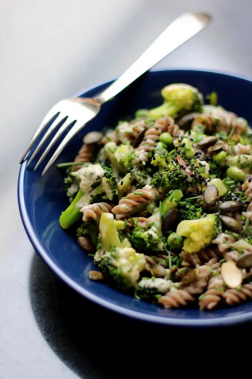 Mélanger les pâtes et les légumes, les arroser avec la sauce au tahini, parsemer de graines de courge et de ciboulette et déguster. Vegan green bowl (glutenfree) On peut ajouter un oeuf poché ou mollet sur le Green Bowl.