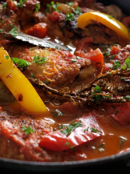 Les poivrons sont emblématiques de la cuisine basque. Très appréciés par la population locale, ils sont cultivés un peu partout au Pays basque. Dans cette recette de poulet basquaise j’utilise des poivrons de différentes couleurs. Vous pouvez éventuellement n’utiliser que des poivrons rouges et compléter par des piments doux verts, pour créer un contraste dans l’assiette. Enfin, si vous ne digérez pas bien ces légumes, mieux vaut les peler avant de les intégrer à cette recette. Pour cela, placer vos poivrons sous le gril du four en les tournant de temps en temps, pour qu’ils noircissent de tous les côtés. Enfermez-les dans un sachet à la sortie du four. En tiédissant, la peau du poivron se détachera très facilement. Une autre option serait de peler les poivrons, mais vous perdriez alors plus de chair du légume.