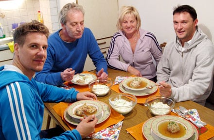 Conseil de Harold (papa de Marc) : Pour la dégustation, commencer par couper la knödel en deux, avec la cuillère à soupe, afin qu’elle puisse tiédir. On n’utilise ni fourchette, ni couteau !